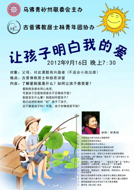此项由马佛青砂洲联委会主办,本林青年团协办,我们荣幸礼请到林秀枝讲师于9月16日晚上7.30前来本林般若讲堂分享“要如何让孩子感受到我们的爱”。